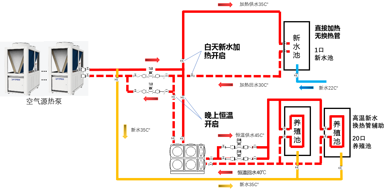1. During the daytime, the new water heating is turned on, the thermostatic piping is turned off, and the 7 main units heat the new water directly. With this system, the actual heating time can be shortened to about 6 hours and heated to 35℃.